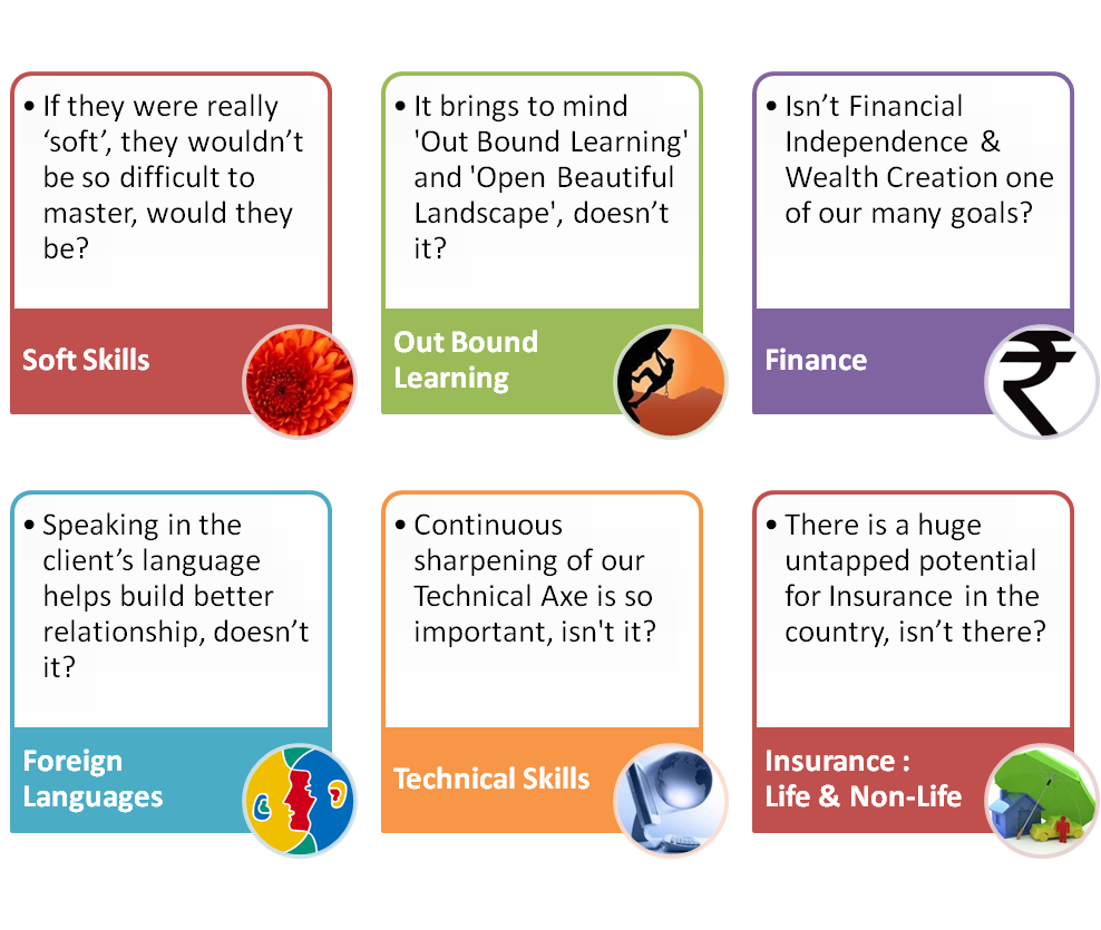 In Consulting, you could benefit from our special domain expertise in HR, Finance and Insurance. In Training, you have a vast choice of various Skill Enhancement programs, comprising the Essential Skills [also called Soft Skills], all areas of Life Insurance, Finance, Investment, and Capital Market, targeted at increasing your Personal & Professional effectiveness.